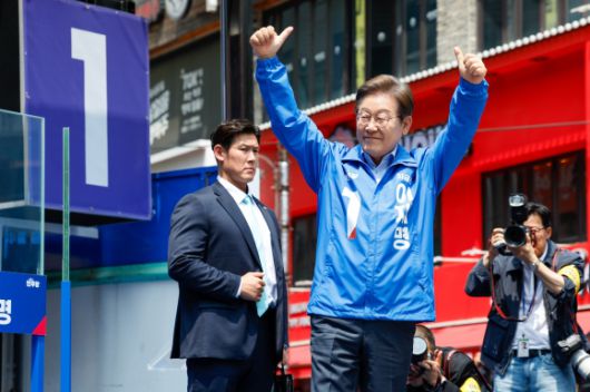 인천 지역구 시민들과 인사하는 이재명 - 이재명(오른쪽) 더불어민주당 대선 후보가 21일 인천 남동구 구월 로데오광장을 찾아 유세를 마친 뒤 시민들에게 인사하는 가운데 경호원이 주변을 지켜보고 있다. 뉴스1 |