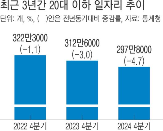 통계청이 21일 발표한 ‘2024년 4분기 임금근로 일자리 동향’을 보면 지난해 4분기 20대 이하(15~29세)의 일자리는 전년보다 4.7%(14만8000개) 줄어든 297만8000개였다. 2018년 통계 작성 이래 가장 많이 감소했다. 임금근로 일자리는 근로자가 사업체에 고용된 일자리를 의미하며, 한 사람이 두 곳에 고용되어 있으면 2개 일자리로 집계한다.