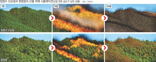 연구 결과를 검토한 이시영 강원대 방재전문대학원 명예교수는 “시뮬레이션상 침엽수림에서 산불이 수관층으로 옮겨붙으며 빠르게 확산되고, 혼합림에서 수관화의 확산이 느리게 진행됐다”면서 “실제 산불 양상과 상당 부분 유사하다”고 말했다.