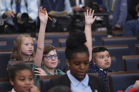 브리핑실에는 추첨을 통해 정해진 20여명의 11세 이하 어린이가 모였다. 부모들은 브리핑실 구석에 선 채 기자석을 자녀들에게 내 줬다. 리빗 대변인의 10개월 된 아들 니코도 참석했다.