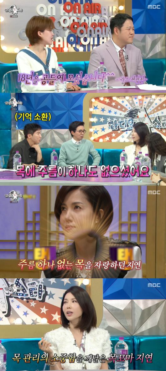 이어 과거 유세윤이 자신에게 목 주름이 없다는 칭찬을 했다면서 "그때 제 목만 쳐다보고 어찌나 놀라시던지. 그때 목 관리의 소중함을 알고 목주름이 생기지 않도록 조심했다. 어머니가 '고개 들어! 두 턱 돼'라고 하시기도 했다"라고 말했다.