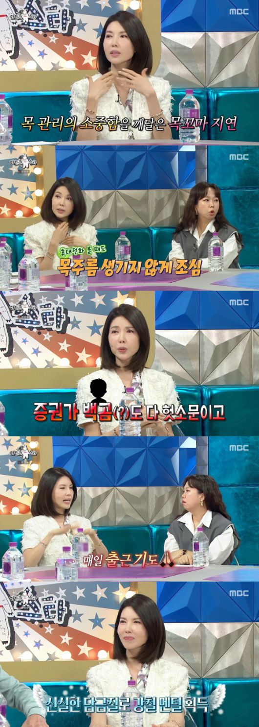 백지연은 "유세윤 씨가 제 목을 보고 어찌나 놀라시던지. 다이아몬드가 있어도 소중한지 모르면 가치가 없지 않나. 그때부터 목에 보습제도 많이 바르고 휴대전화 볼 때도 아래로 보지 않는다. 또 어머니가 어렸을 때부터 '두 턱 되니까 고개 들어라'고 하셨다"며 목주름 관리법을 공개했다.