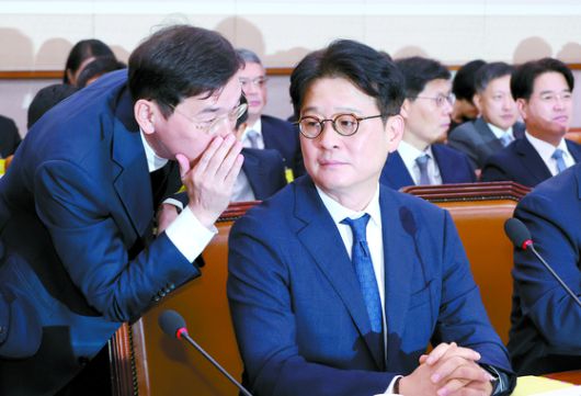 사의를 표명한 이창수 서울중앙지검장(오른쪽)과 조상원 중앙지검 4차장이 지난해 10월 18일 국회에서 열린 국정감사에 출석해 대화하고 있다. 연합뉴스 |