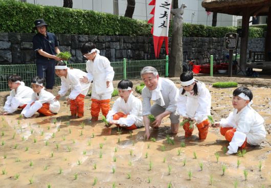 강호동 농협중앙회장은 지난 21 서울 중구 농업박물관 앞 야외농장에서 어린이들과 함께 못줄을 이용한 전통 손모내기 체험행사에 참여했다.