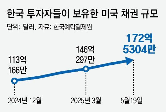 21일 한국예탁결제원에 따르면 19일 기준 개인 투자자들이 보유한 미국 채권은 172억5304만 달러(약 23조9247억 원)에 달한다. 지난해 말(113억166만 달러)과 비교하면 반년도 채 지나지 않아 52.7%나 증가했다.