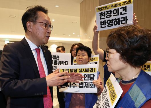 박민수 보건복지부 제2차관(왼쪽)이 21일 서울 용산구에서 열린 ‘진료지원 업무 제도화 방안 공청회’에서 항의에 나선 전국민주노동조합총연맹 공공운수노조 의료연대본부 조합원에게 설명을 하고 있다. 뉴스1 |