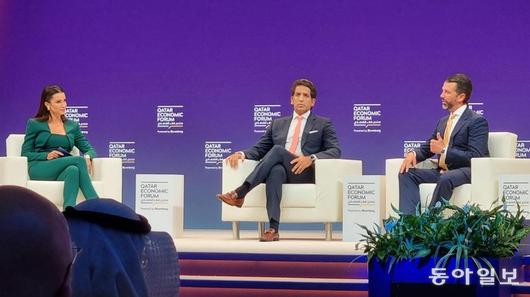 도널드 트럼프 미국 대통령의 장남 트럼프 주니어(오른쪽)가 21일 카타르 수도 도하에서 열린 연례 카타르경제포럼(QEF)의 ‘인베스트 인 아메리카(미국에 투자하라)’ 세션에서 발언하고 있다. 도하=이지윤 기자 asap@donga.com |