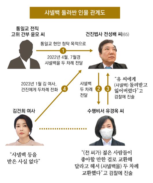 유 씨는 이후 샤넬 매장에서 샤넬백 2개를 각각 다른 제품으로 교환했다. 김 여사 측은 해당 선물을 받은 적도 없고 모르는 일이라고 주장했지만, 수행비서가 영부인 모르게 선물을 자의적으로 처리했다는 설명은 납득하기 어렵다는 분석이 나온다.