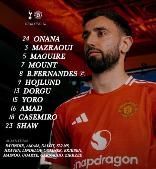 후벵 아모림 감독이 지휘하는 맨유는 3-4-2-1 전형으로 맞선다. 안드레 오나나가 골키퍼 장갑을 끼고, 레니 요로, 해리 매과이어, 루크 쇼가 백3를 형성했다. 3선에서 파트리크 도르구, 카세미루, 브루누 페르난데스, 누사이르 마즈라위가 호흡을 맞추고, 2선에 메이슨 마운트 아마드 디알로가 출전했다. 최전방에서 라스무스 회이룬이 토트넘 골문을 노리고 있다.