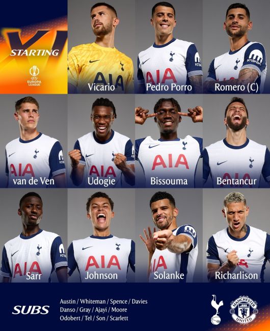 선발 라인업이 공개된 가운데 안지 포스테코글루 감독이 이끄는 토트넘은 4-3-3 전형을 내세웠다. 굴리엘모 비카리오가 골문을 지키고, 데스티니 우도기, 미키 판더펜, 크리스티안 로메로, 페드로 포로가 백4를 구성한다. 중원은 파페 사르, 로드리고 벤탄쿠르, 이브 비수마가 맡고, 최전방 스리톱 라인에 히샬리송, 도미니크 솔란케, 브레넌 존슨이 이름을 올렸다.