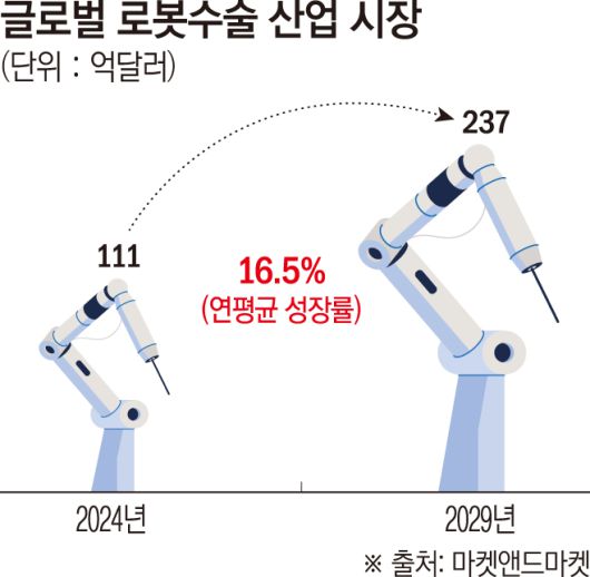 글로벌 로봇 수술 시장 규모도 성장세여서 향후 로봇 수술 분야는 더 확대될 것으로 예상된다. 글로벌 시장조사기관 마켓앤드마켓에 따르면 글로벌 로봇 수술 산업 규모는 지난해 111억 달러(약 15조4389억 원)에서 연평균 16.5% 성장해 2029년 237억 달러(약 32조9595억 원)에 도달할 전망이다.