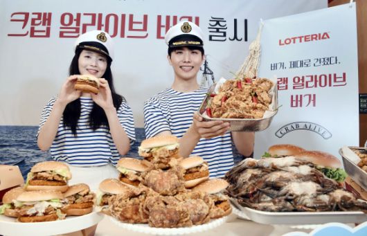 롯데리아는 통째로 씹어먹는 부드러운 게 ‘소프트쉘크랩’을 그대로 튀겨 사용한 ‘크랩 얼라이브 버거’ 2종을 출시한다고 21일 밝혔다. 사진은 이날 서울 중구 롯데리아 동대문역사문화공원역점에서 모델들이 소프트쉘크랩을 소개하는 모습.