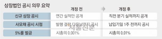 금융위원회는 기업공시 의무를 강화하는 내용의 자본시장법 개정안 및 하위규정이 7월 22일부터 시행된다고 21일 밝혔다. 핵심은 신규 상장법인의 최근 보고서 공시가 추가된 것이다. 지금까지는 직전 회계연도 사업보고서만 제출하면 됐지만, 앞으로는 직전 분기 또는 반기 실적도 5일 이내 반드시 공시해야 한다. 상장 전 실적이 부진했지만 상장 후에야 공개돼 투자자가 피해를 보는 사례를 줄이기 위해서다.