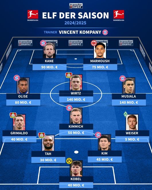 독일 이적시장 전문 매체 '트랜스퍼마크트'는 19일(한국시간) 소셜 미디어를 통해 2024-2025시즌 분데스리가 베스트 11을 공개했다. 이는 매 라운드 팬들이 뽑은 베스트 11 기록을 바탕으로 꾸린 올해의 팀이다.