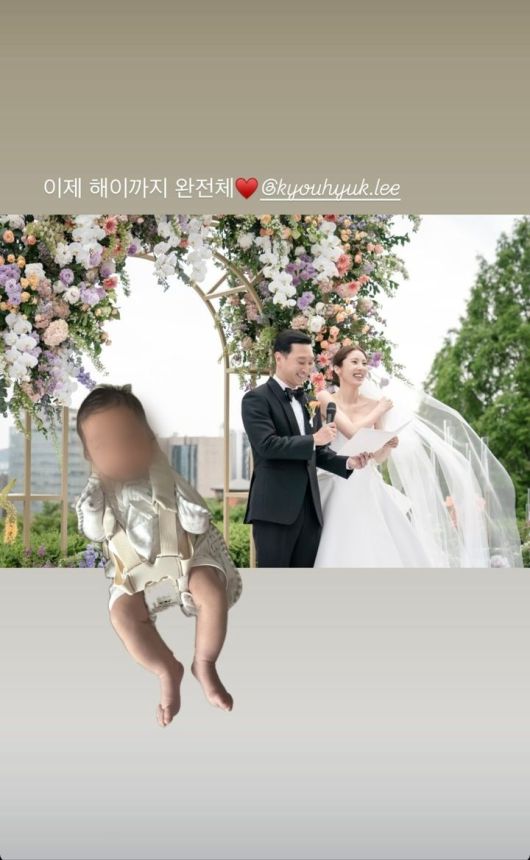 웨딩 화보에 딸 해이 양 사진을 합성한 손담비는 "이제 해이까지 완전체. 우리 가족 파이팅"이라며 가족에 대한 애틋한 마음을 드러냈다.