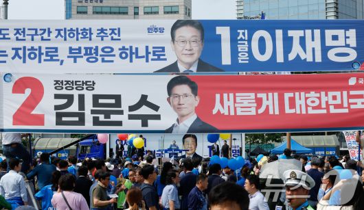 이재명 더불어민주당 대통령 후보가 사흘째 수도권 표심잡기에 나선 21일 오후 인천 부평역 광장을 찾아 지지를 호소하는 가운데 이 후보와 김문수 국민의힘 후보 현수막이 걸려 있다. 2025.5.21/뉴스1 ⓒ News1 안은나 기자 |