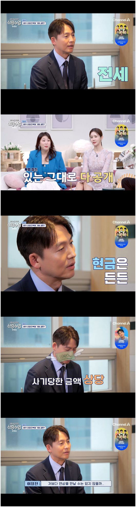이정진은 자신의 자산도 밝혔다. 이정진은 “건대입구에서 전세로 살고 있다. 전세금은 한 20억 원 정도 된다”, “현금은 2~3억 원 정도 보유하고 있다”, “주식은 5억 원, 물론 손해 본 것도 4억 원이 넘는다”, “10억 원은 비상장 회사에 투자 중이다”라고 말했다.