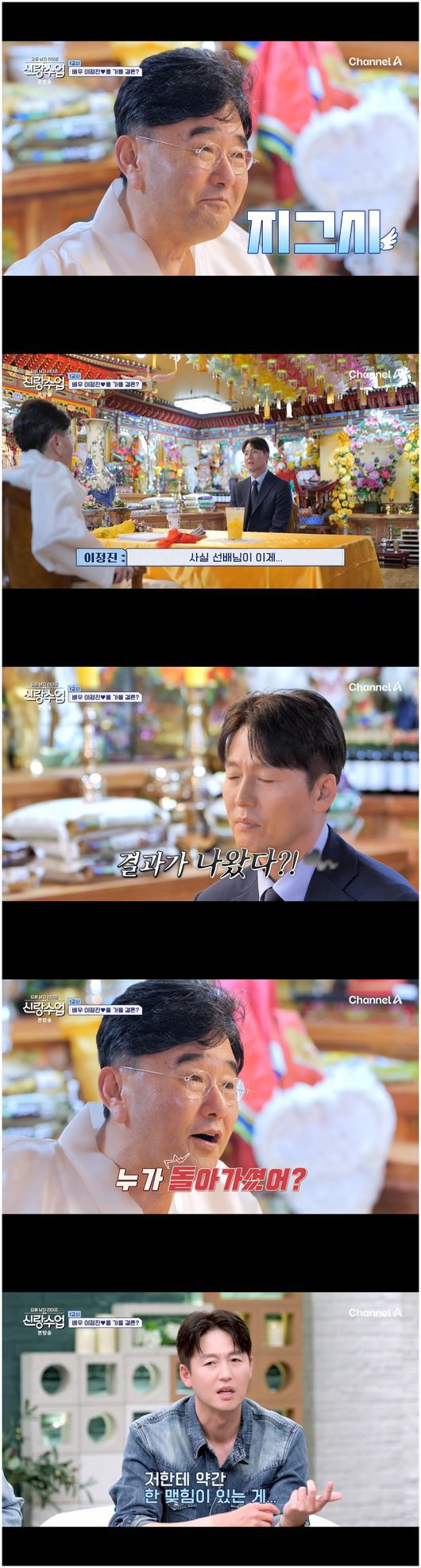 이어 이정진은 무속인이 된 정호근을 찾았다. 이정진은 “선배님께서 신내림 받으시고 방송에서 봤거든요. 나중에 뵀으면 했다. 저희 어머니는 궁금해하셨다”라며 인사를 건넸다. 정호근은 “최근에 만난 인연이 있지 않았어? 그 사람하고 잘 안 되지 않았어?”라며 콕 집었다. 정호근은 “여자 쪽에서 서운함이 많은 거 같다. 왜냐하면 이정진 본인 성격이 섬세하니까, 표정이 확 바뀌고, 그렇지 않았냐”라고 말했다.