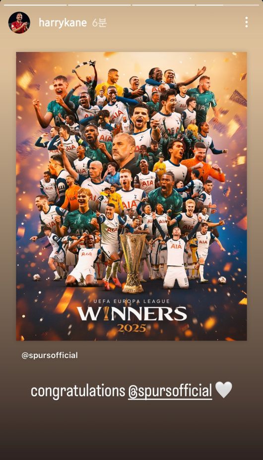 토트넘이 정상에 오른 직후 해리 케인은 자신의 SNS에 토트넘 우승 축하 이미지를 게시했다. 친정팀의 첫 유럽 트로피 획득을 축하하며 레전드다운 반응을 보인 것이다. 비록 현재는 다른 유니폼을 입고 있지만 케인은 여전히 '토트넘의 10번'처럼 그 장면을 지켜보고 있었다.