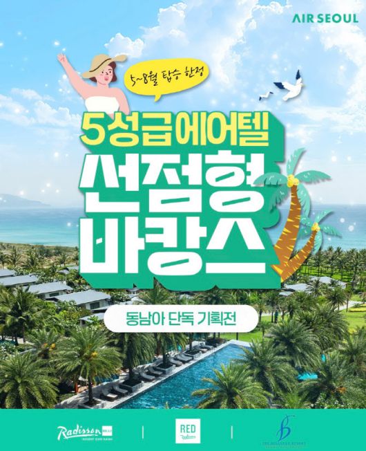 [이데일리 이윤화 기자] 에어서울이 다가오는 여름 성수기에 대비해 동남아 여행을 경제적으로 준비할 수 있는 ‘5성급 에어텔 선점형 바캉스’ 프로모션을 진행한다고 22일 밝혔다.