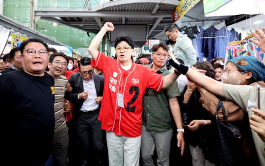 한동훈 국민의힘 전 대표가 21일 대구 중구 서문시장을 찾아 김문수 대선 후보의 지원 유세를 하고 있다 (사진=연합뉴스) |