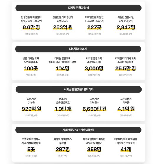 눈에 띄는 또 다른 특징은 지역 기반의 인재 양성과 문제 해결 접근이다. ‘카카오 테크캠퍼스’는 전국 5개 지역 거점 대학과 협력해 실무형 IT 교육을 운영하고 있으며, 287명의 수료생을 배출했다. 동시에 ‘인터넷하는 돌하르방’, ‘제주 임팩트 챌린지’ 등 제주를 중심으로 한 지역밀착형 공익 프로젝트도 병행되었다. 이러한 활동은 전국적 범위의 사회공헌 전략 속에서 지역성을 존중하는 사례로 기능한다.
