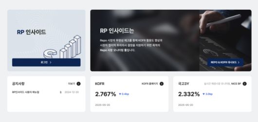 예탁원의 RP인사이드는 변동성이 높은 단기 금융시장의 특성을 반영해 시장의 변화를 바로 파악할 수 있도록 ‘대시보드(그래프 등으로 구성된 계기판 화면)’ 기능을 강조했다. KOFR를 포함해 레포 시장의 업권, 차주신용, 담보, 포지션별 거래 분석을 확인할 수 있고 차입금리 비교를 할 수 있게 했다. 양도성예금증서(CD)·기업어음(CP) 등 주요 단기 금융시장의 지표와 국채·통안증권을 비롯한 채권시장의 금리분석 정보도 제공한다.