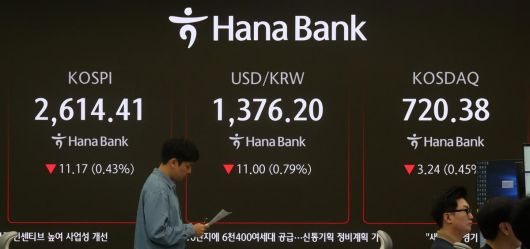 코스피가 전 거래일(2625.58)보다 10.92포인트(0.42%) 하락한 2614.66에 개장한 22일 오전 서울 중구 하나은행 딜링룸 전광판에 지수가 표시 되고 있다. 코스닥 지수는 전 거래일(723.62)보다 2.66포인트(0.37%) 내린 720.96에 거래를 시작했다. 원·달러 환율은 전 거래일 주간거래 종가(1387.2원)보다 10.2원 내린 1377원에 주간 거래를 시작했다. 2025.05.22. 서울=뉴시스 |