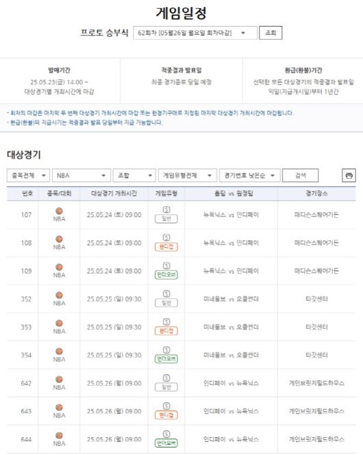 한편, NBA 플레이오프 세 경기를 대상으로 하는 프로토 승부식 62회차의 상세 분석 및 구매 정보는 공식 인터넷 발매사이트 내 토토가이드 페이지에서 확인 가능하다.