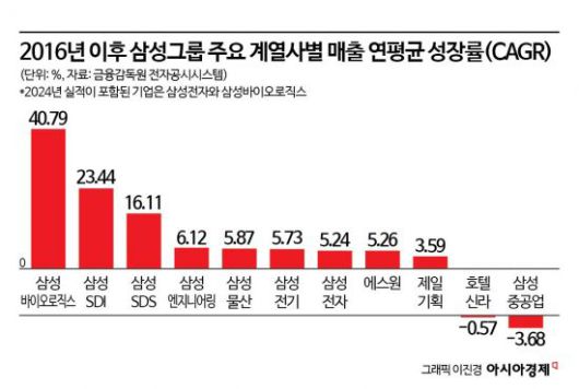 2위인 삼성SDI(23.44%), 3위 삼성SDS(16.11%)를 비롯해 그룹 핵심인 삼성전자(5.24%)보다도 성장률이 훨씬 높았다. 그룹의 중추였던 반도체 사업의 실적이 주춤한 상황에서 바이오 부문의 조직 개편은 의미를 더한다.