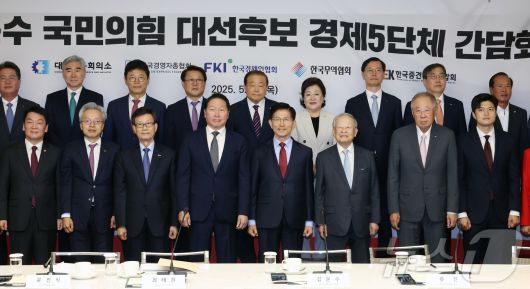 (서울=뉴스1) 이광호 기자 = 김문수 국민의힘 대통령 후보와 최태원 대한상의 회장 등 참석자들이 22일 서울 중구 대한상공회의소에서 열린 경제 5단체장 간담회에 앞서 기념촬영을 하고 있다. 2025.5.22/뉴스1skitsch@news1.krCopyright ⓒ 뉴스1. All rights reserved. 무단 전재 및 재배포, AI학습 이용 금지.