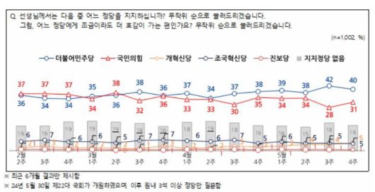 이어 조국혁신당과 개혁신당은 5%, 진보당은 1%로 나타났다. 지지하는 정당이 없거나 모른다고 응답한 태도 유보층은 17%로 조사됐다.