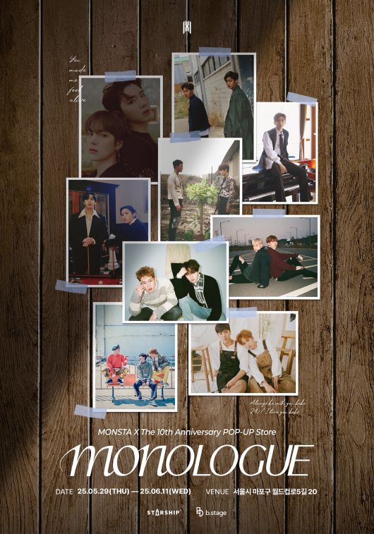 공개된 이미지 속 멤버들의 폴라로이드 사진이 이목을 집중시키는 가운데, 몬스타엑스는 오는 29일부터 6월 11일까지, 총 2주간 서울 마포구 합정동에서 팝업 스토어 '모놀로그'를 개최할 예정이다.
