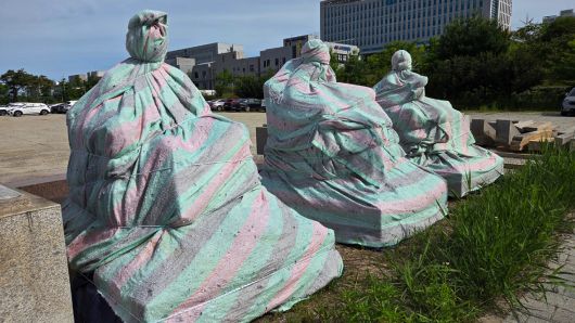 오늘(22일) 오전 전주시 덕진구 만성동의 한 주차장 한쪽에는 부직포를 뒤집어쓴 이들 동상이 놓여 있습니다.