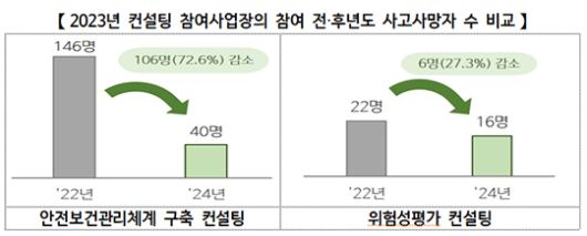 22일 고용노동부에 따르면 2023년 위험성평가 컨설팅, 안전보건관리체계 구축 컨설팅을 지원받은 사업장에서 컨설팅 전‧후 2년 동안 사고사망자 수가 66.7% 감소했다.