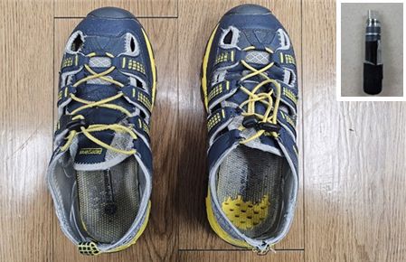 50대 A씨가 지하철 1호선에서 불법촬영 범죄를 저지를 당시 신고 있떤 신발과 신발에 설치한 볼펜형 카메라/ [국토교통부 철도특별사법경찰대 제공] |