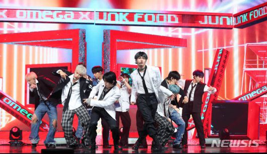 [서울=뉴시스] 김혜진 기자 = 그룹 오메가엑스가 7일 오후 서울 광진구 예스24라이브홀에서 열린 세 번째 미니앨범 'iykyk(if you know, you know)'(이프 유 노, 유 노) 발매 기념 쇼케이스에서 무대를 선보이고 있다. 타이틀 곡 'JUNK FOOD'(정크 푸드)는 불안정한 느낌의 신스와 베이스가 혼란스러운 분위기를 자아내는 트랩 장르의 힙합곡이다.  2023.11.07. jini@newsis.com