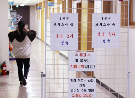2025학년도 5월 고3 전국연합학력평가가 실시된 8일 경기도 수원시 영통구 효원고등학교 3학년 교실 복도에 안내문이 붙어 있다. 2025.5.8. 연합뉴스 |