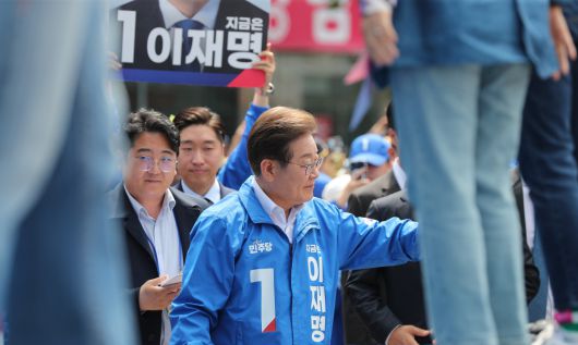 이재명 더불어민주당 대선 후보가 22일 오전 제주시 일도일동 동문로터리 집중 유세장에 입장하고 있다. |