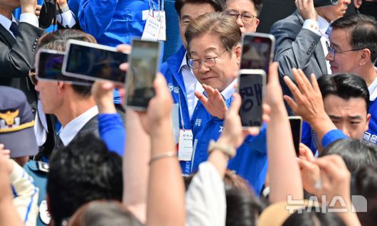 [제주=뉴시스] 우장호 기자 = 이재명 더불어민주당 대선 후보가 22일 오전 제주시 일도일동 동문로터리에서 열린 유세장에서 지지자들에게 손을 흔들어 인사하고 있다. 2025.05.22. woo1223@newsis.com
