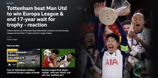 BBC는 아예 스포츠 메인을 손흥민의 트로피 시상식 장면으로 도배했다. 매체는 "손흥민은 축구계에서 가장 호감 가는 인물이다. 토트넘이라는 클럽에 정말 헌신적인, 놀라운 선수"라며 손흥민의 커리어 첫 번째 우승 소식을 알리는 동시에 손흥민의 평판을 알렸다.