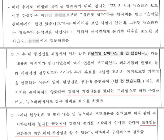 구체적으로 검찰은 한상진 기자가 김만배 녹취록을 보도한 2022년 3월 6일 지인에게 ‘윤석열 잡아야죠. 한건 했습니다'라는 문자를 보냈다고 했다. 지난해 4월 열린 '뉴스타파 v. 윤석열' 사건 공판 전 증인신문에서였다. 이에 한상진 기자는 검찰의 법정 주장이 허위라고 반박했다. 뉴스공장 등 유튜브 시사 프로그램에 출연해 “‘윤석열 잡아야죠’라는 문자를 보낸 적은 있지만 ‘한 건 했습니다’라는 문자는 보낸 적도 받은 적도 없다”라고 했다.