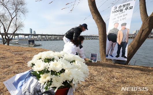 [서울=뉴시스] 최진석 기자 = 서울시가 지난 2021년 4월 한강공원에서 숨진 채 발견된 의대생 고(故) 손정민(당시 22세)씨 추모공간에 대해 자진 철거 명령을 내린 것이 위법이라며 공간 관리자가 제기한 소송이 1심에 이어 2심에서도 각하됐다. 사진은 지난해 1월 서울 반포한강공원에 마련된 손씨를 기리는 1000일 추모공간에서 시민들이 헌화를 하고 있는 모습. 2024.01.19. myjs@newsis.com |