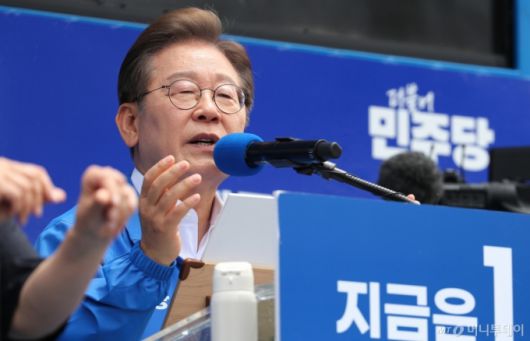 [제주=뉴시스] 우장호 기자 = 이재명 더불어민주당 대선 후보가 22일 오전 제주시 일도일동 동문로터리에서 열린 유세에서 연설을 하고 있다. 2025.05.22. |