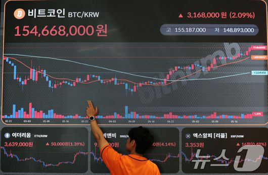 (서울=뉴스1) 황기선 기자 = 22일 서울 서초구 빗썸라운지 전광판에 비트코인 등 가상자산 시세가 표시되고 있다. 이날 비트코인은 글로벌 코인 시황 중계사이트인 코인마켓캡에서 오전 10시를 전후로 11만724달러까지 치솟아 11만달러를 돌파했었다. 비트코인이 11만달러를 돌파한 것은 사상 처음이다. 이로써 비트코인은 지난 7일간 6.63%, 한 달간은 25.12%, 1년간은 56.10% 각각 급등했다. 2025.5.22/뉴스1