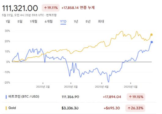 비트코인 가격과 금가격 올해 가격 현황 비교. 연초까지 반대로 움직이던 비트코인과 금 가격이 4월말부터 비슷하게 움직이고 있다(사진=구글파이낸스) |