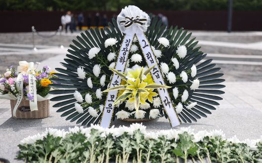 노 전 대통령 묘역 비석 앞쪽에는 전날 이곳을 찾은 ‘어른’ 김장하 전 남성문화재단 이사장이 놓고 간 근조 화환이 놓였다. 노 전 대통령은 2001년 김 전 이사장이 운영하는 진주시 남성당 한약방에 예고 없이 들러 김 전 이사장과 만난 적 있다. 김 전 이사장은 봉하마을을 찾은 뒤 방명록에 “노무현 대통령님 그립습니다”라고 적었다.