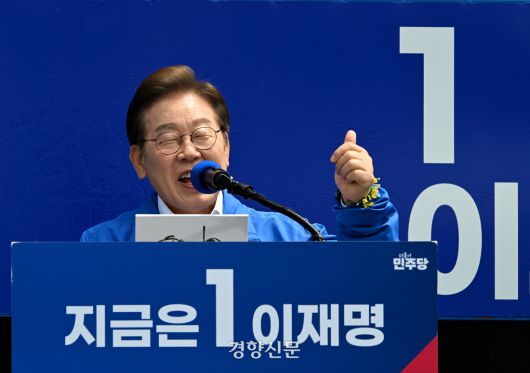 이재명 더불어민주당 대선 후보가 22일 오전 제주시 동문로터리에서 열린 유세에 참석해 연설을 하고 있다. 박민규 선임기자 |