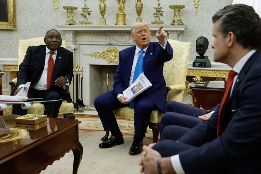 알렉산더 기자가 백인 남아공 농민 집단학살 주장 관련 질문을 해도 트럼프는 “너는 수치스러운 놈이다”라며 질타했다. 알렉산더 기자는 물러서지 않고 트럼프에게 “만약 실제로 (남아공 정부가) 집단학살을 저지르고 있다면 왜 라마포사 대통령을 백악관에 초청했느냐”고 물었고 트럼프는 “조용히 해, 조용히”라며 다른 기자를 지목해 질문을 넘겼다.