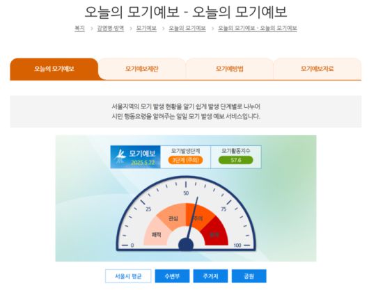 서울시가 2016년부터 매년 5월부터 10월까지 발표하는 일별 모기예보에 따르면 22일 모기활동지수는 57.6을 나타내며 올들어 처음 주의단계가 발효됐다.